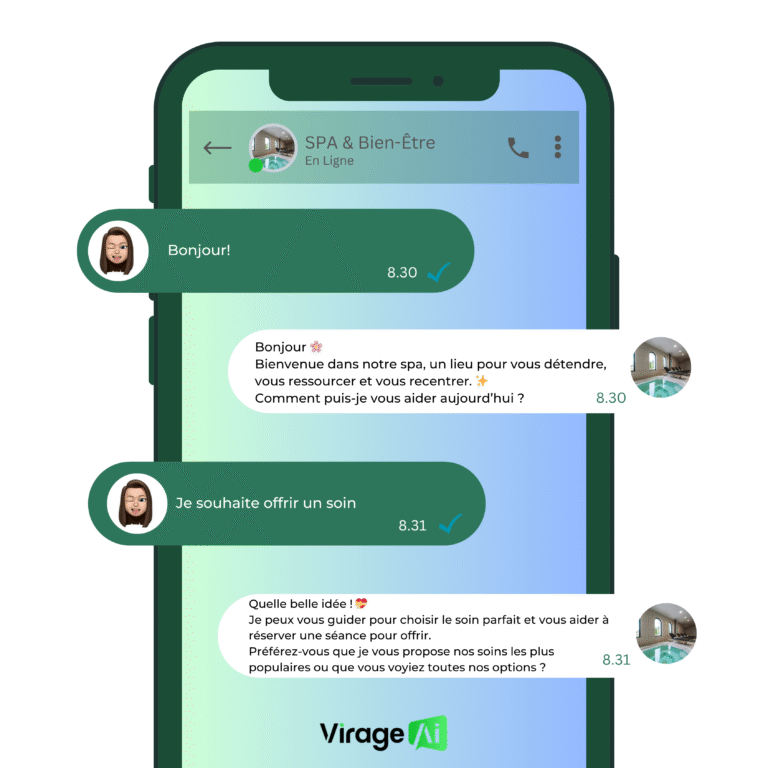 Avec Virage AI, votre SPA se dote d’un assistant intelligent capable d’accompagner chaque client, en ligne sur votre site et directement sur WhatsApp.